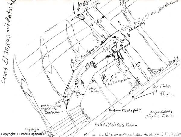 Ich erinnere mich an meine "Malstunde" am Scherstock / Mastfuß. Um mir einen Sitzplatz zu verschaffen, mußte ich ca. einen Kubikmeter Pflastersteine über Bord werfen. Dann setzte ich mich in das so entstandene Loch auf den Schiffsboden und fertigte auf einem Alublech eine Skizze an. Mit einem Zollstock nahm ich die Maße ab und übertrug sie in meine Skizze. Ein paar kleiner Barsche beobachteten mich mißtrauisch. Es dauerte etwa 45 Minuten, dann kroch die Kälte in meinen Anzug und ich zitterte erbärmlich. Meine steifen Finger konnten den Bleistift nicht mehr richtig halten. Dann bin ich nach oben in die Wärme geflüchtet, mit der fertigen Skizze. Ab 3m Wassertiefe war es taghell und ich spürte die Wärme des Oberflächenwassers.